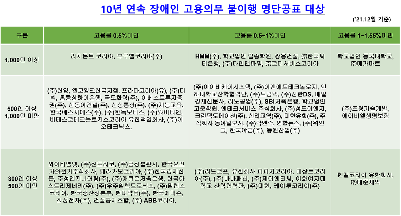 한편, 고용노동부는 지난 2022년 12월 20일에 장애인 고용률이 현저히 낮음에도 불구하고, 장애인 고용을 위한 노력을 기울이지 않은 기관 및 기업의 명단을 공표했다.
