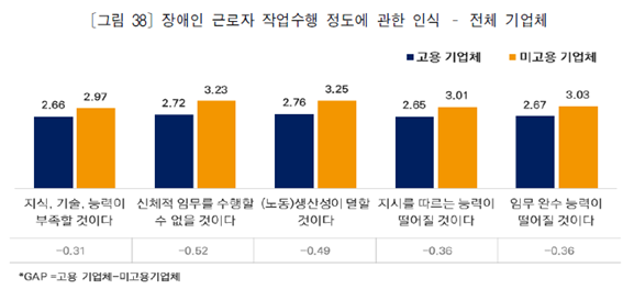 장애인 근로자의 작업수행 정도에 관한 인식에서 장애인 미고용 업체의 경우 전반적으로 부정적 시각을 가지고 있는 것으로 나타났다. 또한 장애인 고용 시 발생하는 비용에 대한 인식도 미고용 기업체의 경우 전반적으로 더 부담이 든다는 부정적인 견해가 많았다.