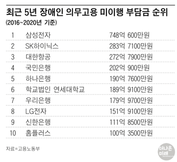 한편, 장애인 고용부담금은 상시 근로자 50명 이상의 민간기업과 공공기관을 대상으로 의무고용률을 지키지 못했을 때 부과된다. 장애인 의무고용률을 지키지 않은 민간 기업의 고용부담금 총액이 지난해 6,900억원 규모로 확인됐다. 2021년 9월 28일, 국회 여성가족위원회 소속 송옥주 더불어민주당 의원이 고용노동부로부터 제출받은 ‘대기업집단 장애인 의무고용 현황’과 ‘장애인 의무고용 미이행 민간기업 고용부담금 자료’에 따르면, 민간 기업 7,956곳이 2020년 납부한 장애인 고용부담금 규모는 6,904억 9,540만 원이며 의무고용률을 지킨 대기업 집단은 전체의 약 12%에 불과했다.