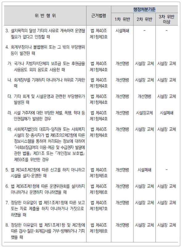 보건복지부장관, 시・도지사, 시장・군수・구청장은 상기 행정처분의 요건에 해당할 경우 시설의 개선, 사업의 정지, 시설의 장의 교체를 명하거나, 시설의 폐쇄를 명할 수 있다.