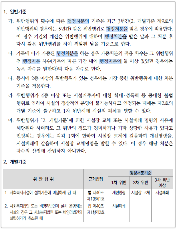 사회복지사업법 시행규칙[시행 2022. 6. 22.] [보건복지부령 제889호, 2022. 6. 22., 일부개정] 제26조의2(행정처분의 기준)에서는 법 제40조제3항의 규정에 의한 행정처분의 세부적인 기준은 별표 4와 같다.