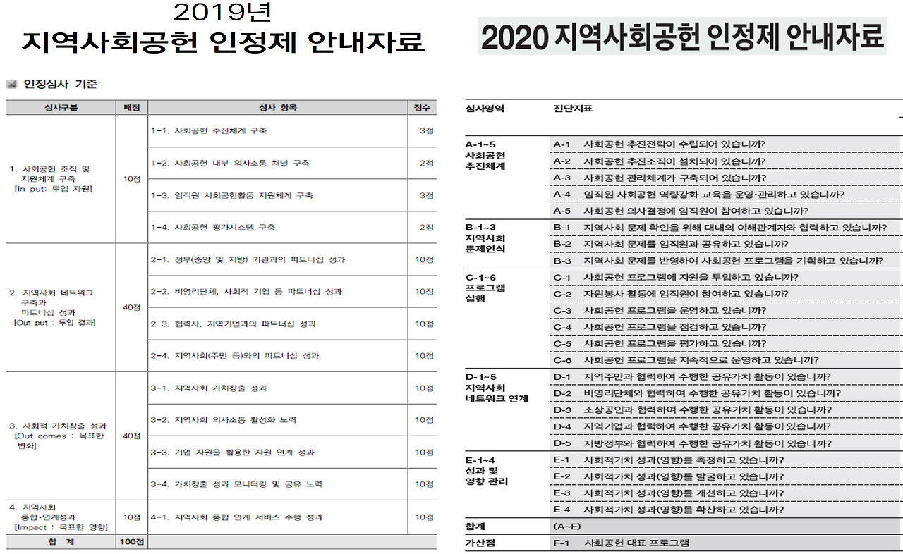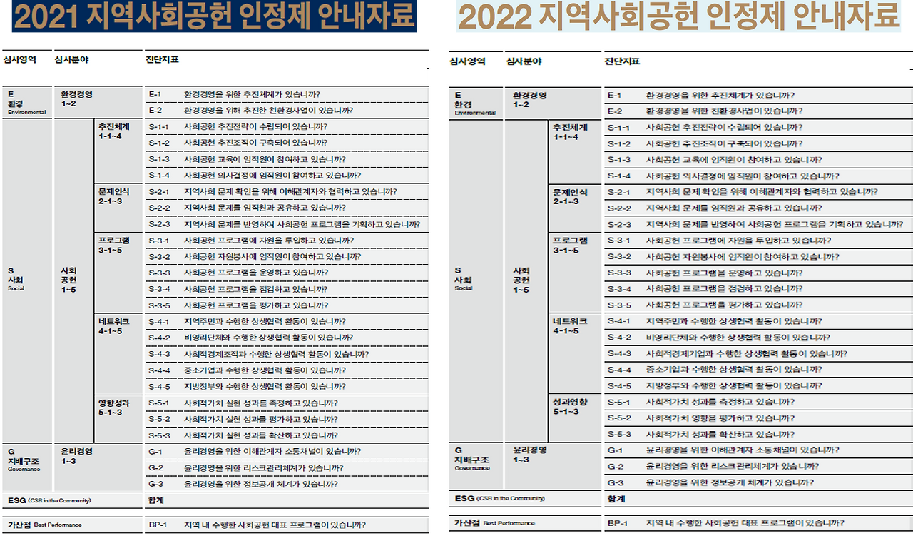2019년에는 4개 분야 13개 항목에 대해 심사하였고, 2020년에는 5개 분야 23개 항목에 대해 심사하였으며 대표 프로그램에 대한 가산점을 추가하였다. 2021년에는 환경(Environmental)과 지배구조(Governance)를 추가하여 7개 분야 52개 항목에 대한 심사 기준을 마련하였고, 지역 내 수행한 사회공헌 대표 프로그램에 대한 가산점을 유지하였으며, 2022년에도 동일한 기준으로 적용되었다.