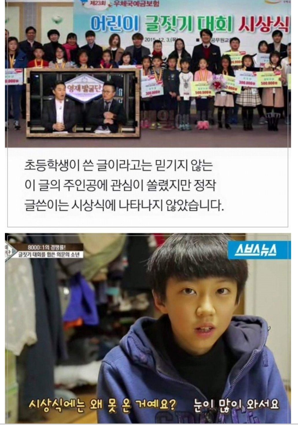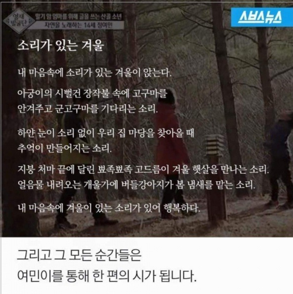 2015년 12월 우체국 예금 보험 글짓기 대상을 탄 14세의 산골소년 정여민 군이다.