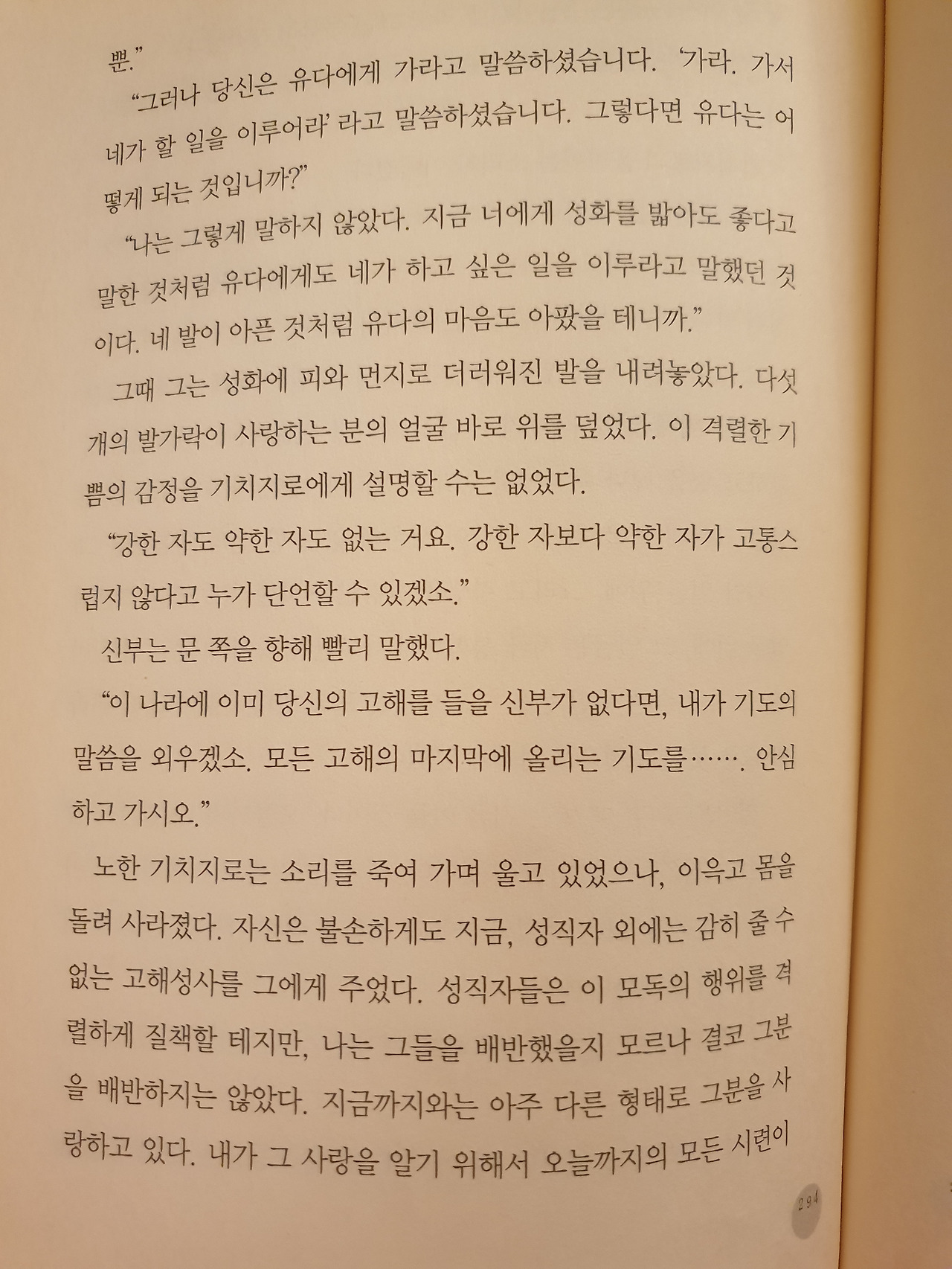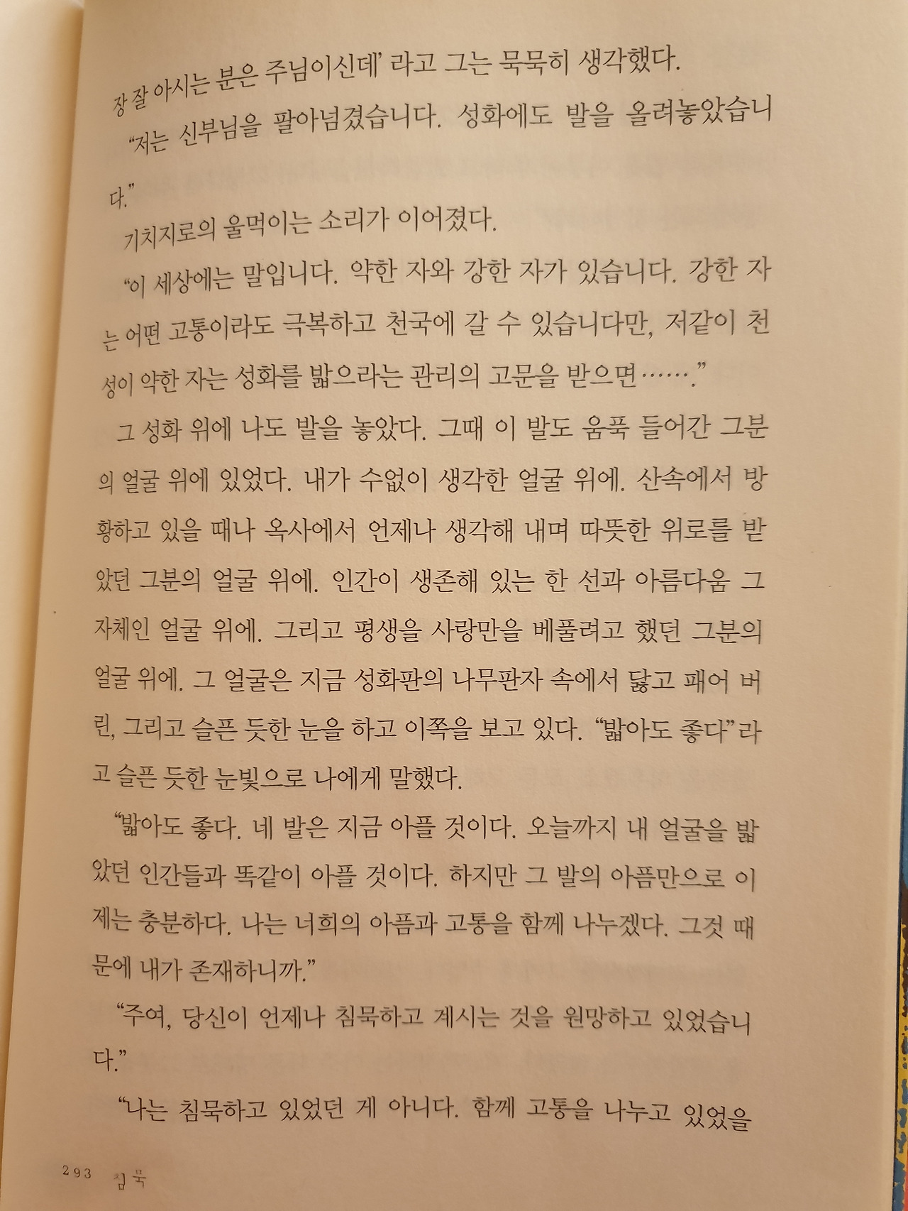 "신부는 발을 들었다. 발이 저린 듯한 무거운 통증을 느꼈다. 그것은 단순히 형식만은 아니었다. 지금까지 자신의 전 생애를 통해 가장 아름답다고 생각해온 것, 가장 맑고 깨끗하다고 믿었던 것, 인간의 이상과 꿈이 담긴 것을 밟는 것이었다. 이 발의 아픔, 그때, 밟아도 좋다고, 동판에 새겨진 그분은 신부에게 말했다.