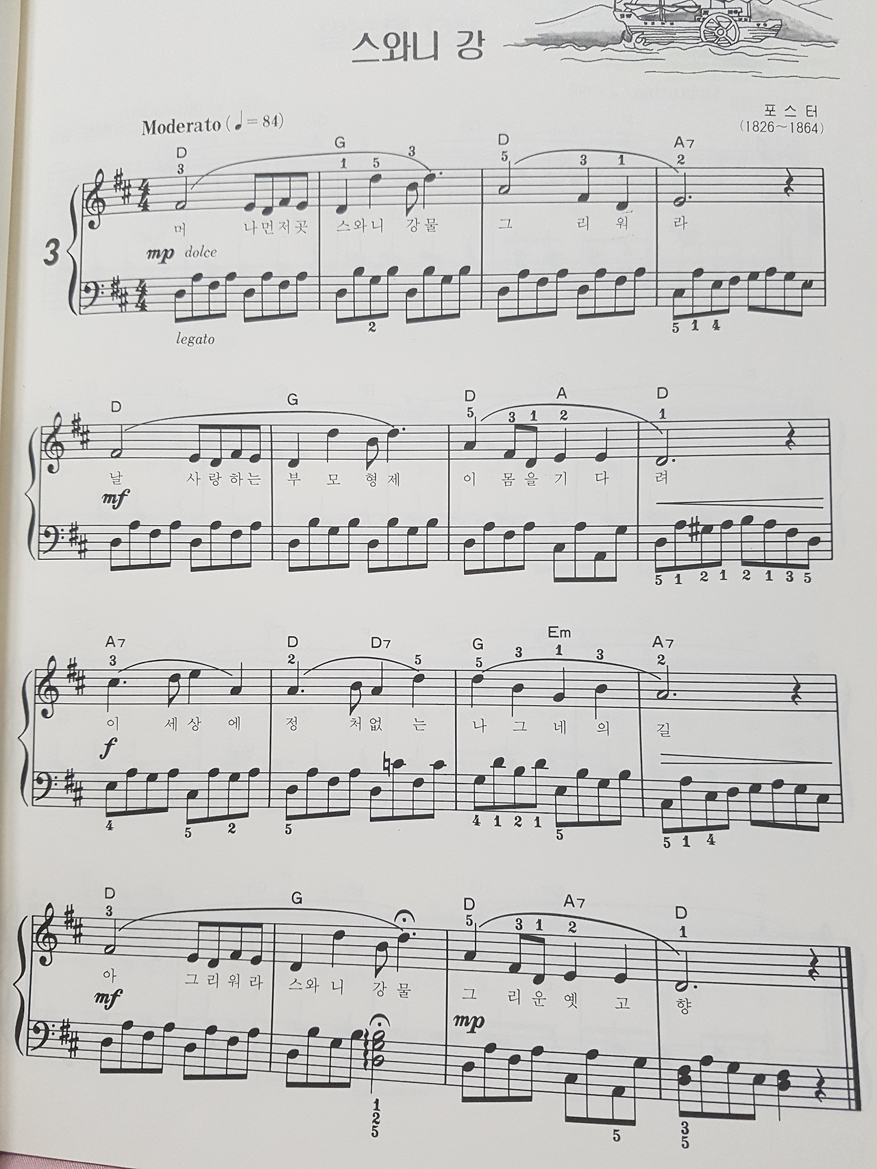 중간의 악보는 세광음악출판사 <피아노 소곡집 1>에 나온 스와니강 으로 역시 16마디이다. <피아노 소곡집>은 흔히 바이엘 하 권까지 배운 수준의 단계면 시작할 수 있다.