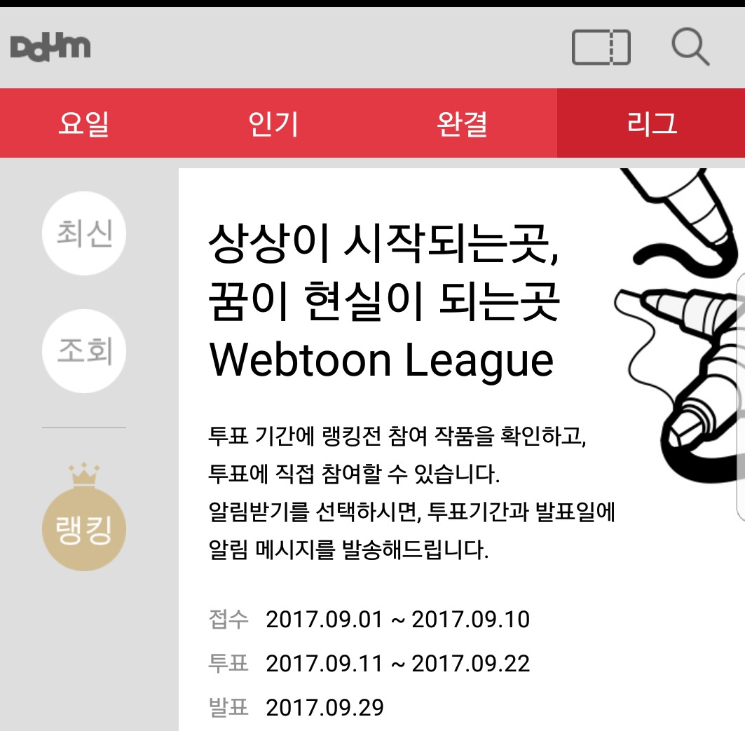 그동안 연재만화만 보아오던 나와 같은 독자들이 계실 듯 하여 리그와 베도를 보는 방법을 자세히 설명한다. 정식연재만화도 훌륭하지만 이렇게 신생작가들의 작품 중에서도 좋은 작품을 만나 평점과 댓글을 다는 일 또한 웹툰독자로서 중요한 역할이라 생각하기 때문이다.