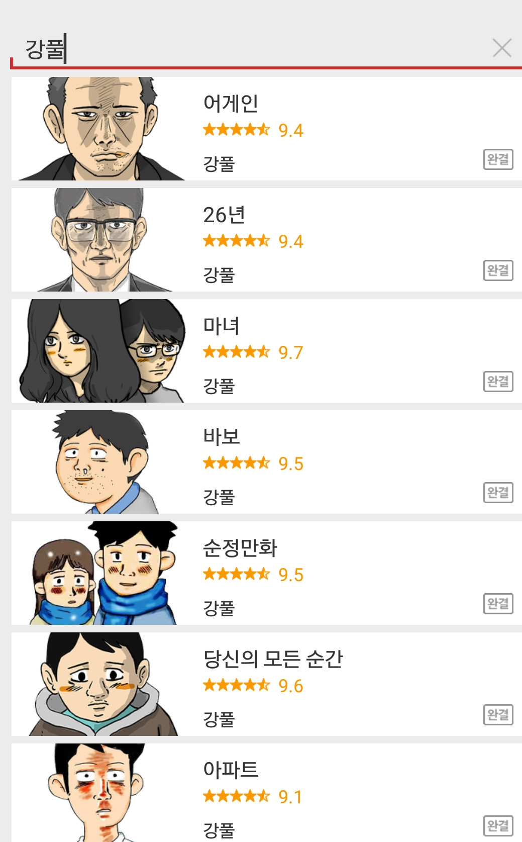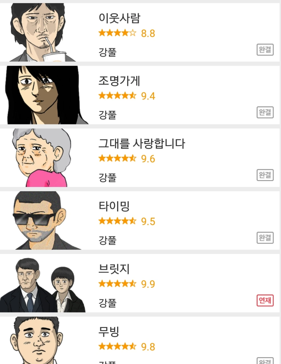-강풀님이 지난 15년간 다음웹툰에 연재한 작품들, 현재 매주 월요일 <브릿지>가 연재 중이다.