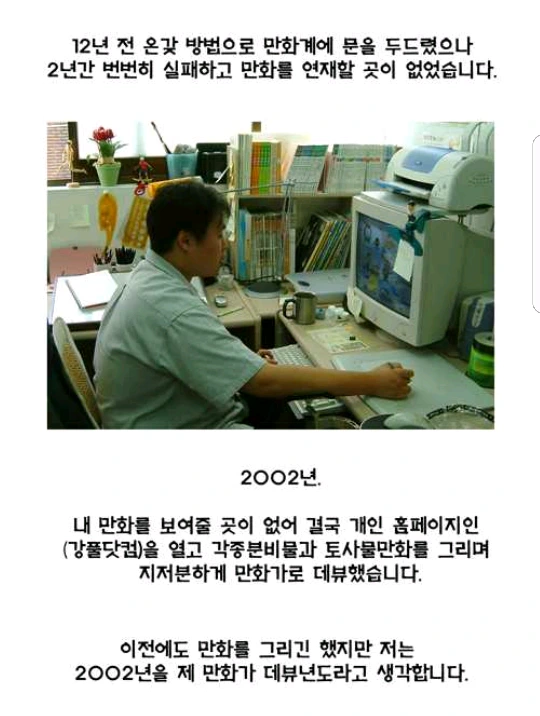 파란색 이야기화면이 전부이던 PC통신이 총천연색 인터넷으로 발전하기 전, 만화가가 되는 길은 유명작가의 문하생이 되어 수년 간 수련하고 데뷔하거나, <보물섬>,<윙크> 같은 만화전문잡지의 응모에 당선되는 방법이 전부였다. 또 그 때 만화는 모두 흑백이었는데 출판인쇄비용 때문에 컬러만화는 아동용 학습만화 정도로 한정되었고, 신간이 나오면 표지 그리고 앞장에 한 페이지나 두 페이지 정도 컬러일러스트가 추가되는 정도였다.