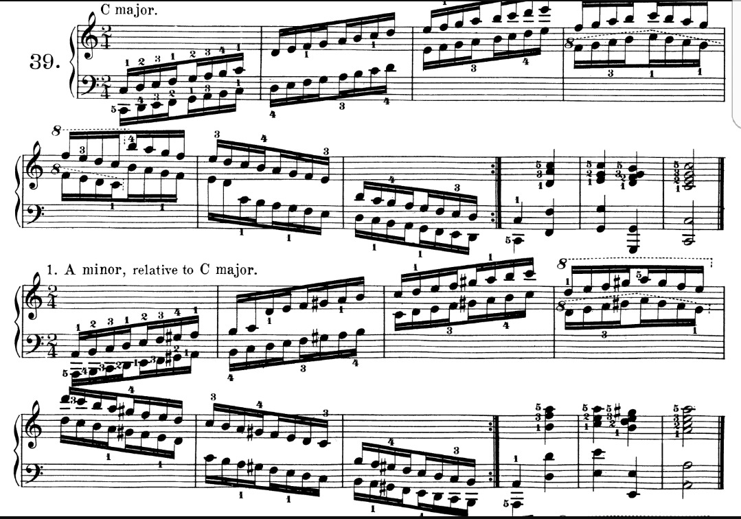 하농 39번은 12개의 각 조가 3개씩(메이저, 마이너 melodic, 마이너 harmonic) 4옥타브가 그려진 악보로, 종이가 모자란듯 다닥다닥 그려 놓았어도, 여러장을 넘긴 이후에야 40번을 보게되는, 끝이 안 보이는 악보이다.