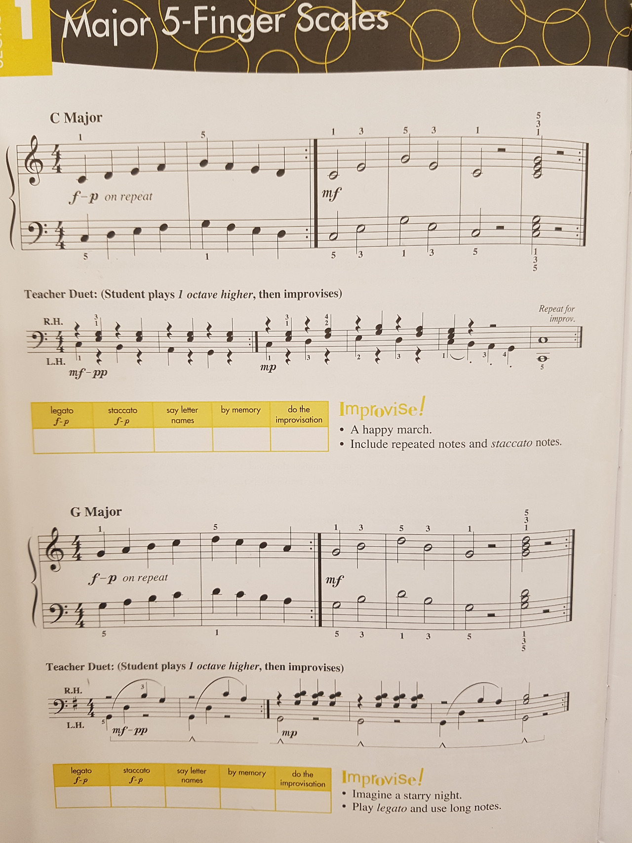 위의 연습이 어렵다면, 처음부터 4옥타브의 스케일 연습을 바로 들어갈 필요는 없다. 처음에는 다섯 손가락을 기준으로 하여 공부해도 좋다. 옥타브 스케일 연습에 어려움을 느낀다면 다음과 같은 5음 스케일 연습도 추천한다.