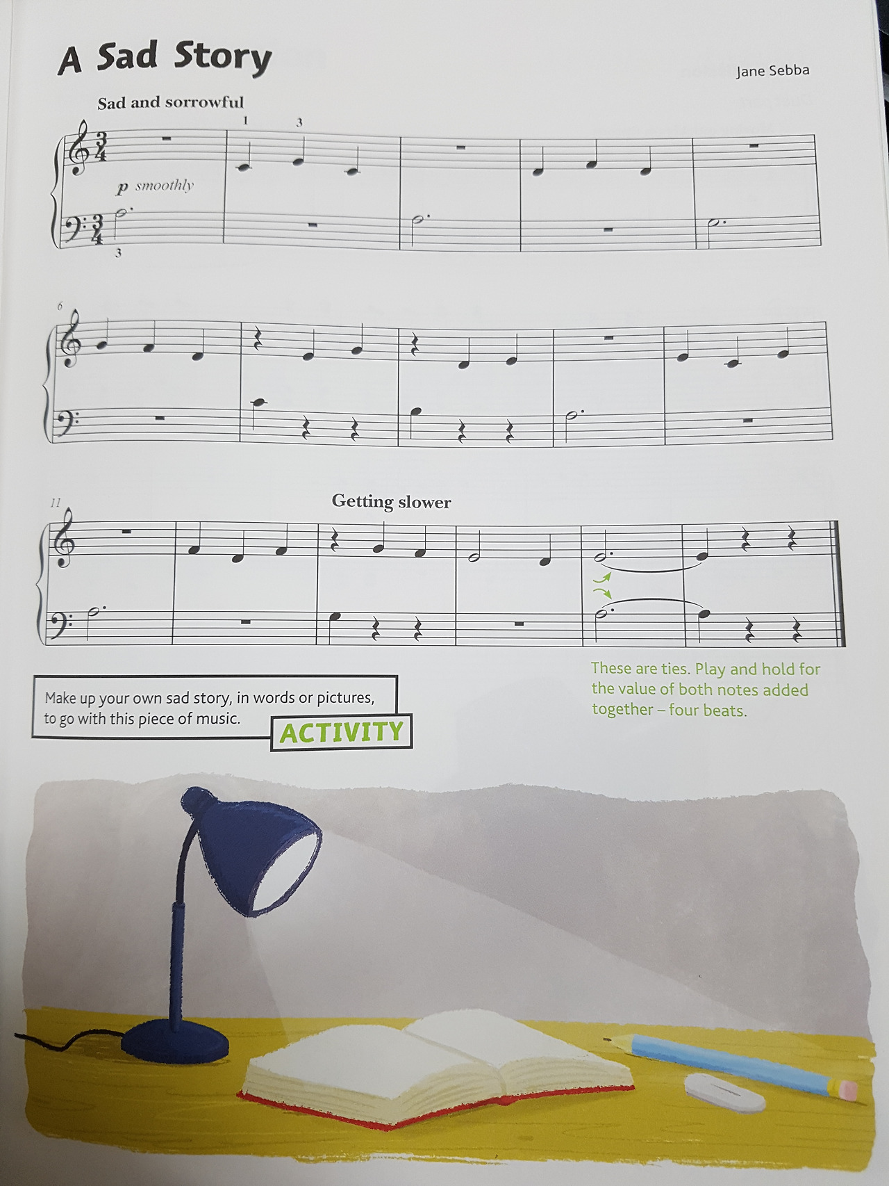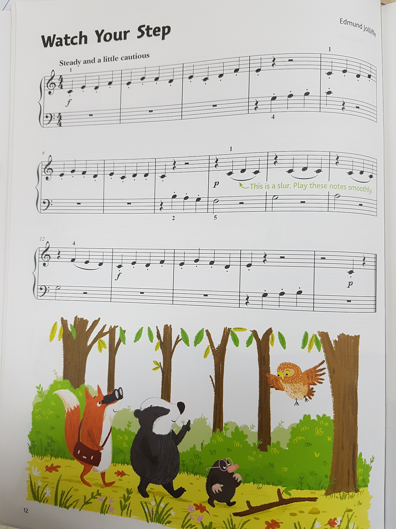 위의 곡은 <Piano Star1>에 실린 두 곡으로 책을 펼친 양쪽면이 장조와 단조의 곡으로 되어있어 장단조 느낌의 비교, 슬러(이음줄)와 타이(붙임줄)의 비교 공부에도 좋은 페이지였다.