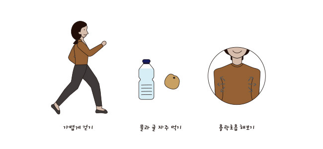 열이 내려가고 통증도 거의 사라졌다면 조금씩 움직여보자. 단, 평소 잘 하던 운동도 아픈 상태에서는 무리가 될 수 있기 때문에 가벼운 동작으로 한다. 집안을 돌아다니거나 밖에서 가볍게 산책하는 것만으로도 충분히 도움이 된다. 해가 떠있는 낮에 하는 것이 좋다. 햇빛은 비타민D 흡수, 숙면에 도움을 주기도 하고 해가 지면 추워져 몸에 무리를 줄 수도 있다.