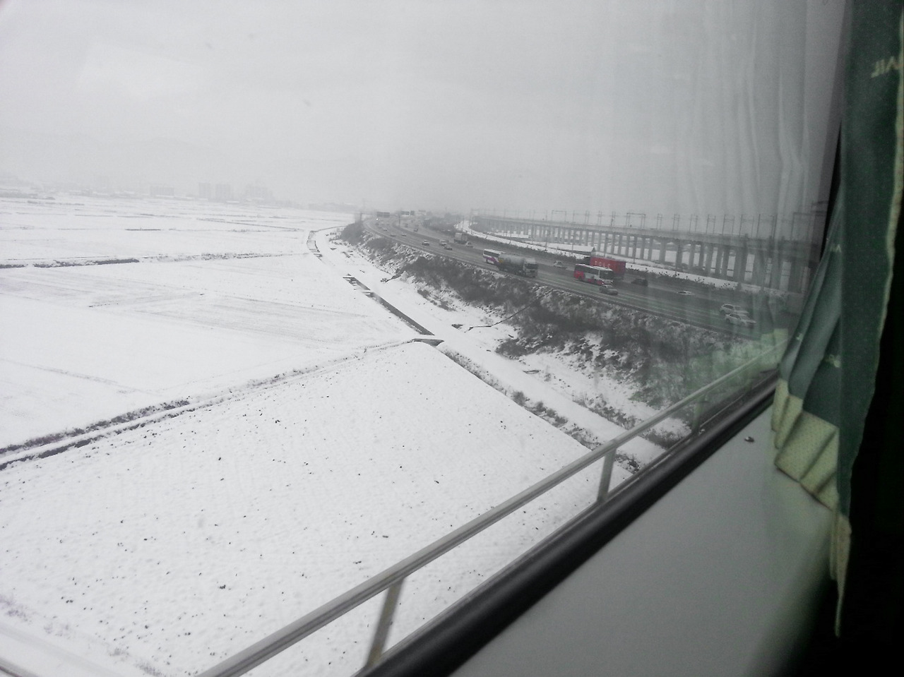 눈에 덮여 온통 하얀 기차 창밖 논뷰