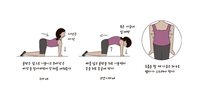 다음으로 등근육을 늘려 호흡할 때 같이 움직일 수 있도록 해야 한다. 나는 등근육이 너무 굳어있어 아예 움직이지 않는다. 스트레칭을 해서라도 근육을 펴줘야 한다. 이때 도움이 되는 자세가 요가에서 하는 소자세와 고양이자세다. 네발로 기는 자세를 취한 후 무릎과 골반, 어깨와 손목이 각각 일직선이 되도록 중심을 잡는다. 그리고 골반을 앞으로 기울이고 허리를 잘록하게 만드는 소자세와 골반을 뒤로 기울이고 배를 넣고 등을 위로 동그랗게 마는 고양이자세를 반복한다.