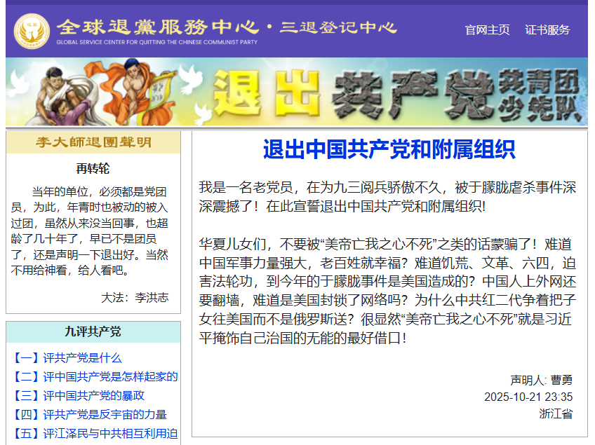 저는 오랜 당원입니다. 9월3일 열병식을 거행한 직후, 위멍룽 학살 사건에 깊이 충격을 받았습니다. 저는 중국 공산당과 그 산하 조직에서 탈퇴할 것을 맹세합니다. 중국 국민 여러분, "미 제국주의자들은 우리를 파괴하려 한다"라는 주장에 속지 마십시오. 강력한 중국 군대가 인민의 행복을 의미합니까? 대기근, 문화대혁명, 6.4사건, 파룬궁 박해, 그리고 올해의 위멍룽 사건은 모두 미국의 소행입니까? 중국 국민들은 여전히 인터넷에 접속하려면 만리방화벽을 넘어야 합니다. 미국이 인터넷을 차단하고 있습니까? 중국 공산당 "공산당" 2세대는 왜 자식들을 러시아가 아닌 미국에 보내려고 합니까? "미 제국주의자들은 위를 파괴하려 한다"는 말은 시진핑이 국가 통치의 무능함을 은폐하기 위한 최고의 변명임이 분명합니다! (2025년 10월 21일 성명)