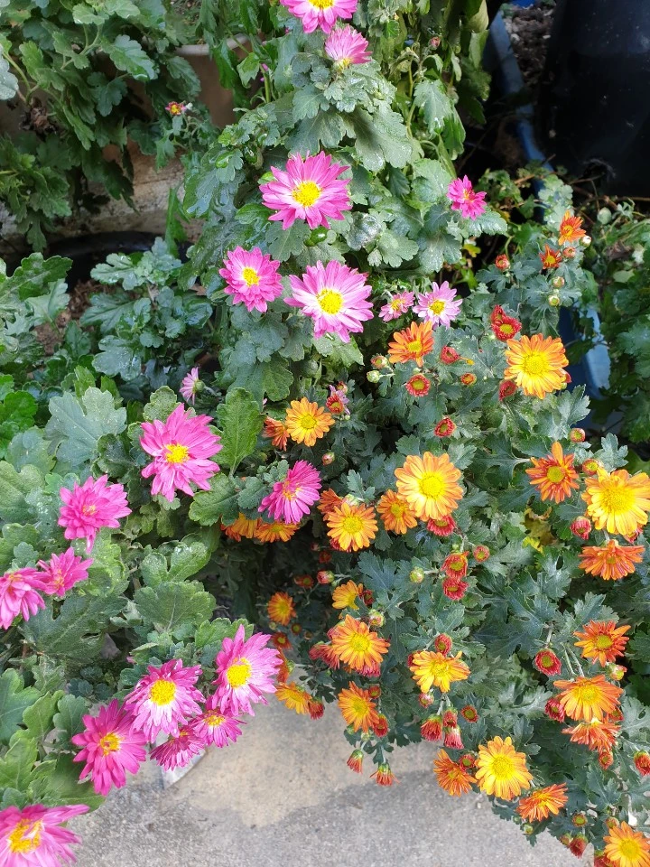 물 한 모금에 다시 싱싱하게 일어서는 국화들.