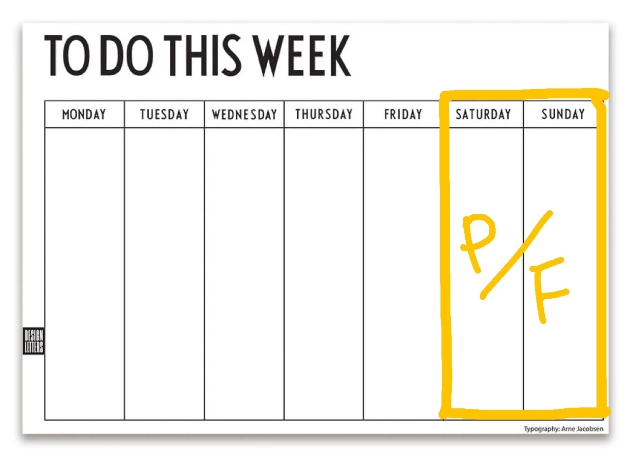 월~금의 공부계획을 짜고 주말은 비워두는 것을 추천한다. 주말은 Pass/Fail의 날이다. 지난 5일간의 체크리스트를 훑어보고 계획한 바를 모두 완료했다면, 주말엔 공부는 Pass! 놀 때는 제대로 놀아야 공부할 때 딴생각이 안 든다. 반대로 평일 공부가 제대로 체크되어있지 않다면 주말엔 Fail! 이번 주말은 못했던 공부를 마저 보충하는 날이다. 그리고 한 주를 마무리하는 일요일 저녁은 다가오는 새로운 주간의 플랜을 짜면서 마무리한다.