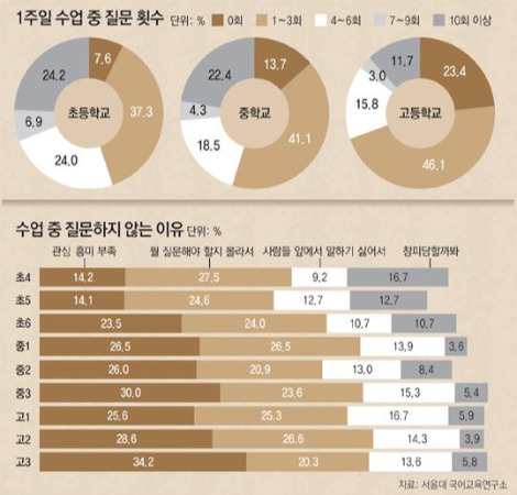 이 통계 자료를 보고 놀란 점은, 초등 -> 중등 -> 고등학교 순으로 질문하는 학생 수가 급격히 줄어든다는 것이다. 이에 대한 원인으로 사실 한 가지밖에 떠오르지 않는다. 우리 교육이 "입시 중심"교육이기 때문. 점점 시험이 중요해지면서 교과서 진도나 시험 범위가 중요해지는 상황에서 '질문'은 그저 쓸데없이 시간만 잡아먹는 수다 정도로 치부되기 마련이다. 그래도 학생들에게 질문을 유도해보려고 열심히 가르치시는 교육자 분들도 많지만, 기대만큼 학생들도 따라와 주지 않는다. 질문을 해 본 적이 없으니 뭘, 어떻게 질문해야 하는지도 모르기 때문이다.
