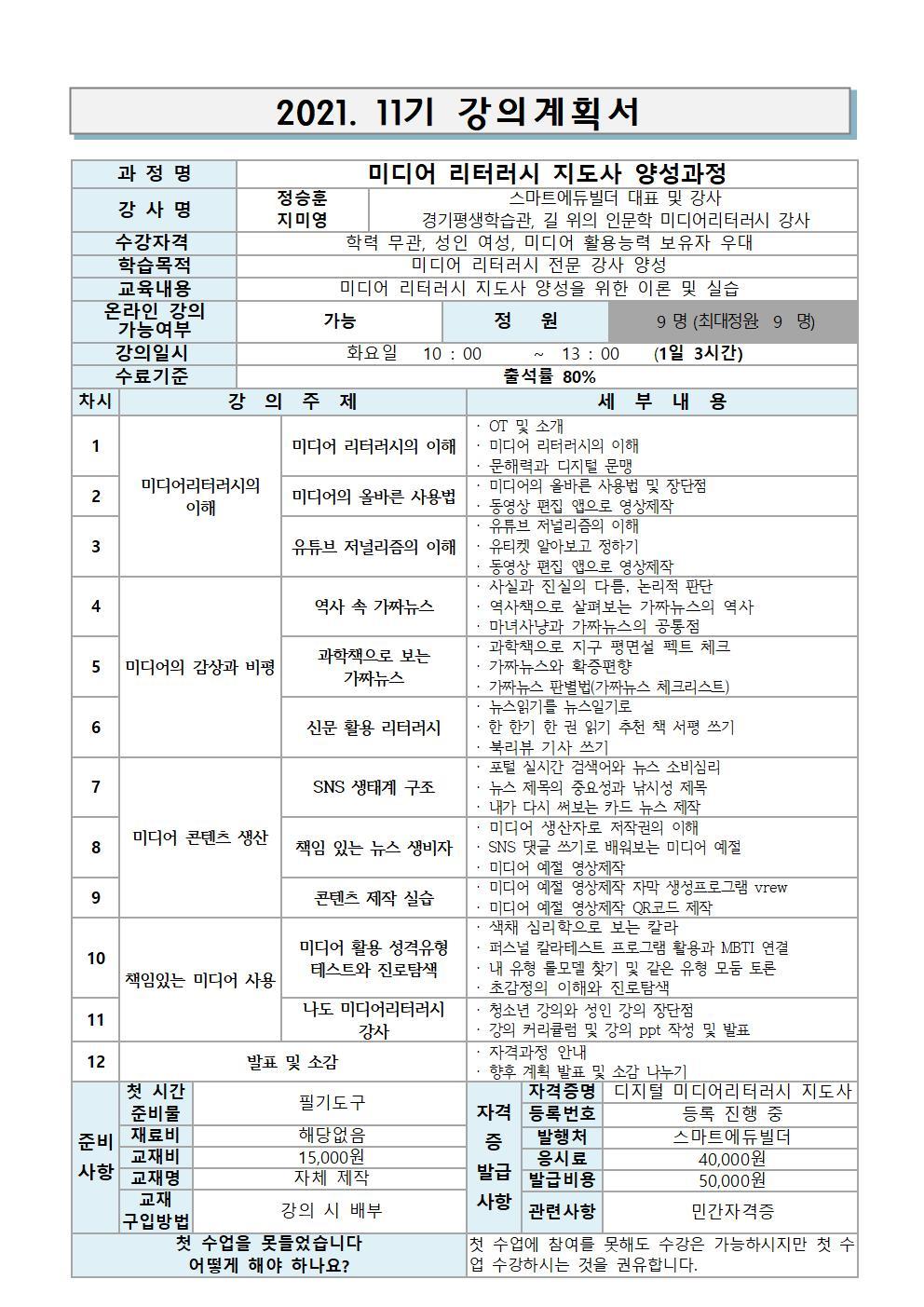 8월부터 송파여성경력이음센터에서 미디어리터러시 지도사 양성과정 1기를 진행해요. 올해 초부터 관련 책과 영상 등을 보며 3개월간 스터디를 하며 만들어낸 커리큘럼이거든요. 민간자격과정도 등록 중에 있어요. 스마트에듀빌더에서 2021년 가장 먼저 계획한 프로그램이예요. 자체 자격과정도 계획하고 있어요.