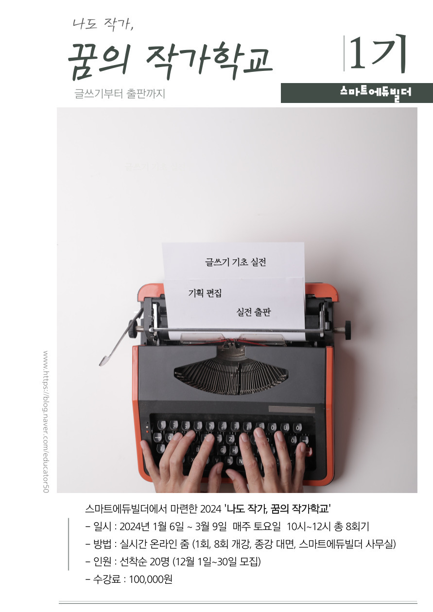꿈의 작가학교 1기 스마트에듀빌더에서 마련한 2024 '나도 작가, 꿈의 작가학교' - 일시 : 2024년 1월 6일 ~ 3월 9일 매주 토요일 10시~12시 총 8회기 (2월 10일, 3월 2일 휴강) - 방법 : 실시간 온라인 줌 (1회, 8회 개강, 종강