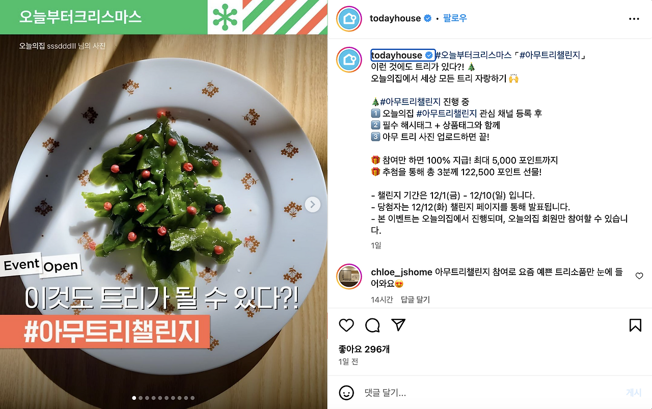 인테리어 플랫폼 오늘의집에서 크리스마스 맞이 기념한 #아무트리챌린지 이벤트. 일반 트리 인증하기나,