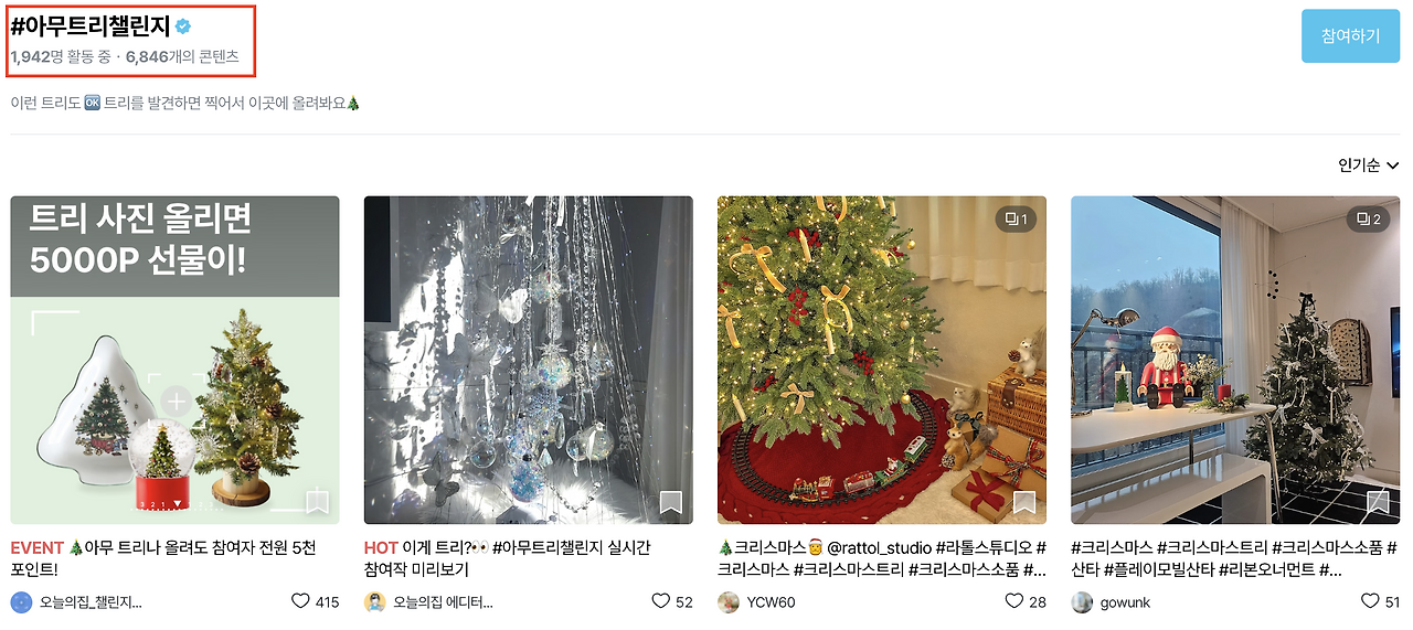 집꾸미기, 트리 챌린지에 머물렀으면 "홈/인테리어"에 참여작이 대부분이었을텐데 "아무트리"로 바꾸면서 푸드까지 자연스럽게 확장이 되고, 누구나 쉽게 참여할 수 있게 되었다.