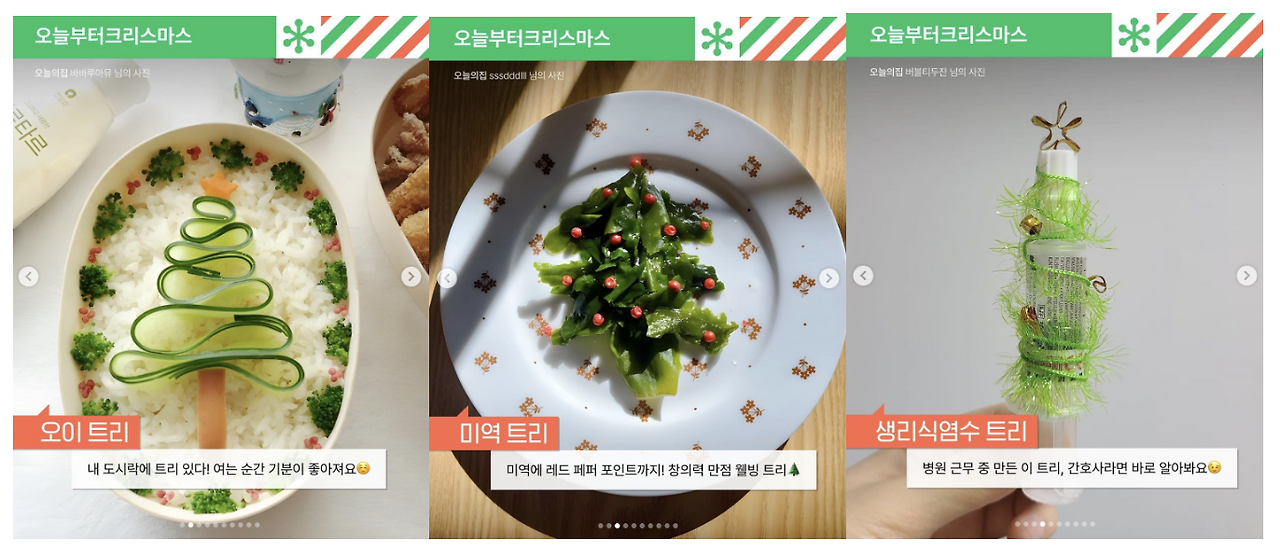 최근에는 연말 분위기를 즐기는게 어느정도 자리를 잡아, 조금 더 색다르고 이색적으로 즐길 수 있는 방법들을 많이 찾는 것 같다. 그리고 우리나라 사람들의 귀여운 특성상 새로운 것을 보면 따라하고 싶어하고, 더 잘하고 싶어하고, 재밌는 것을 하고 싶어하는 특성들을 반영해 "귤트리 만들기" "크리스마스 음식"도 눈에 많이 보인다. #아무트리챌린지도 이와 비슷한 맥락으로, 유저들이 생산하고 원하는 "이색" 니즈를 잘 파악한 것 같다.