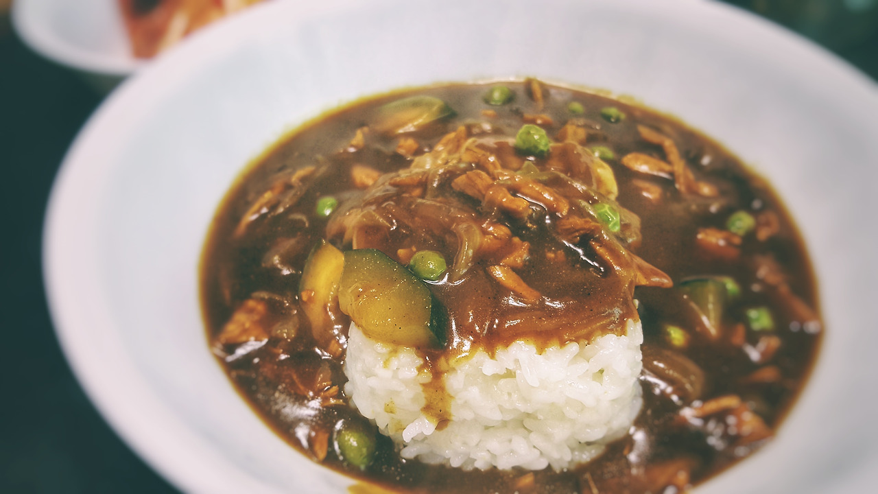 큰 그릇에 흰쌀밥을 담고 그 위에 찐한 카레를 얹는다. 참기 힘들지만 잠시 놔둔다.