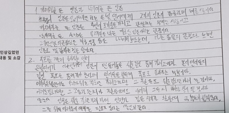 초록강이 인간을 싫어하기만 하는 은빛 연어에게 2가지 인간의 종류라며 해준 말이다. 카메라를 든 인간은 자연에 호기심을 가지고 관찰하는 무해한 사람이고, 낚싯대를 든 사람은 물고기들을 낚는 해로운 인간이라는 관점이다. 그동안 인간의 관점으로만 해충, 익충 등을 나눠서 봤는데 다른 동물의 관점으로 보면 우리 인간도 똑같다는 것을 알았다.(아들의 생각)