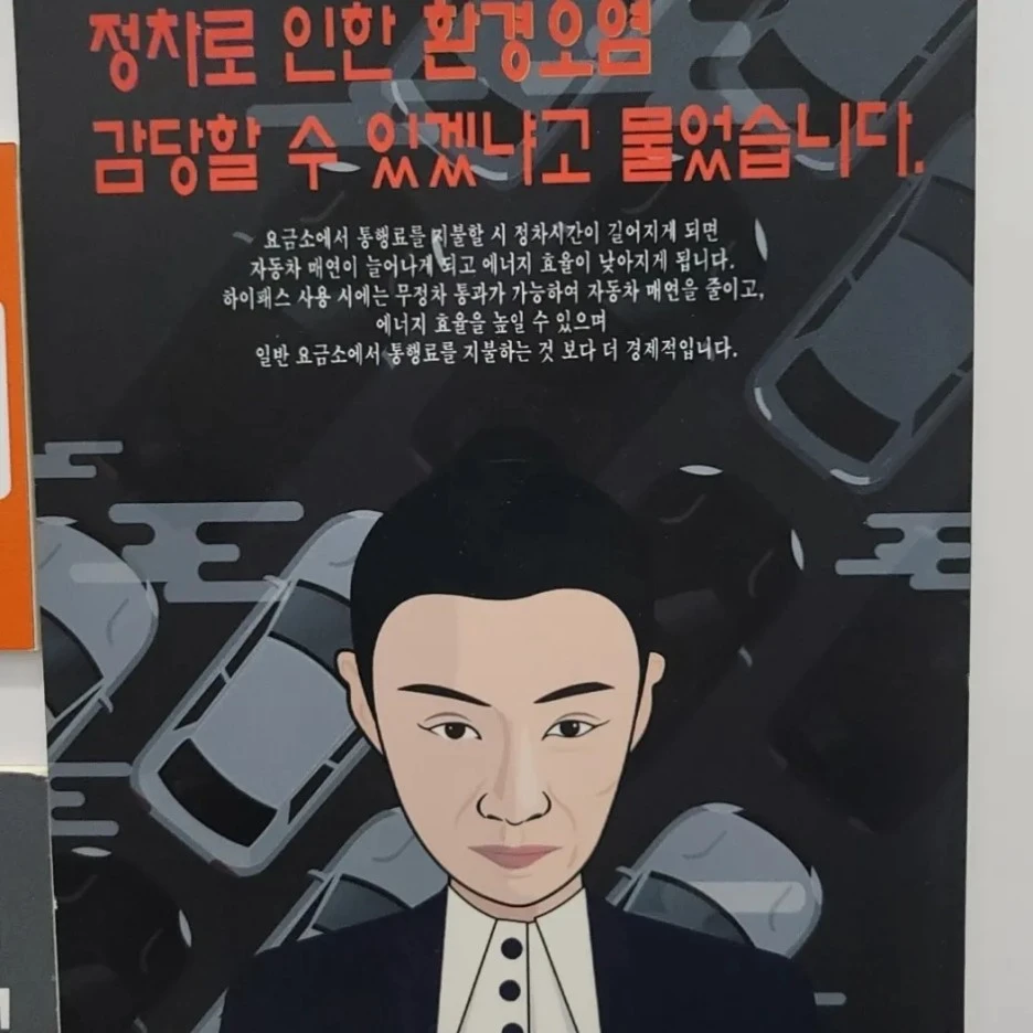 정차로 인한 환경오염, 감당할 수 있겠냐고 물었습니다. 요금소에서 통행료를 지불할 시 정차시간이 길어지게 되면 자동차 매연이 늘어나게 되고, 에너지 효율이 낮아지게 됩니다. 하이패스 사용 시에는 무정차 통과가 가능하여 자동차 매연을 줄이고, 에너지 효율을 높일 수 있으며 일반 요금소에서 통행료를 지불하는 것보다 더 경제적입니다. - 언양휴게소 화장실 글귀 -