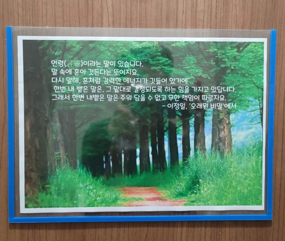 언령이라는 말이 있습니다. 말속에 혼이 깃든다는 뜻이지요. 다시 말해, 혼처럼 강력한 에너지가 깃들어 있기에 한번 내뱉은 말은, 그 말대로 결정되도록 하는 힘을 가지고 있답니다. 그래서 한번 내뱉은 말은 주워 담을 수 없고 무한 책임이 따르지요. - 이정일, 오래된 비밀 -