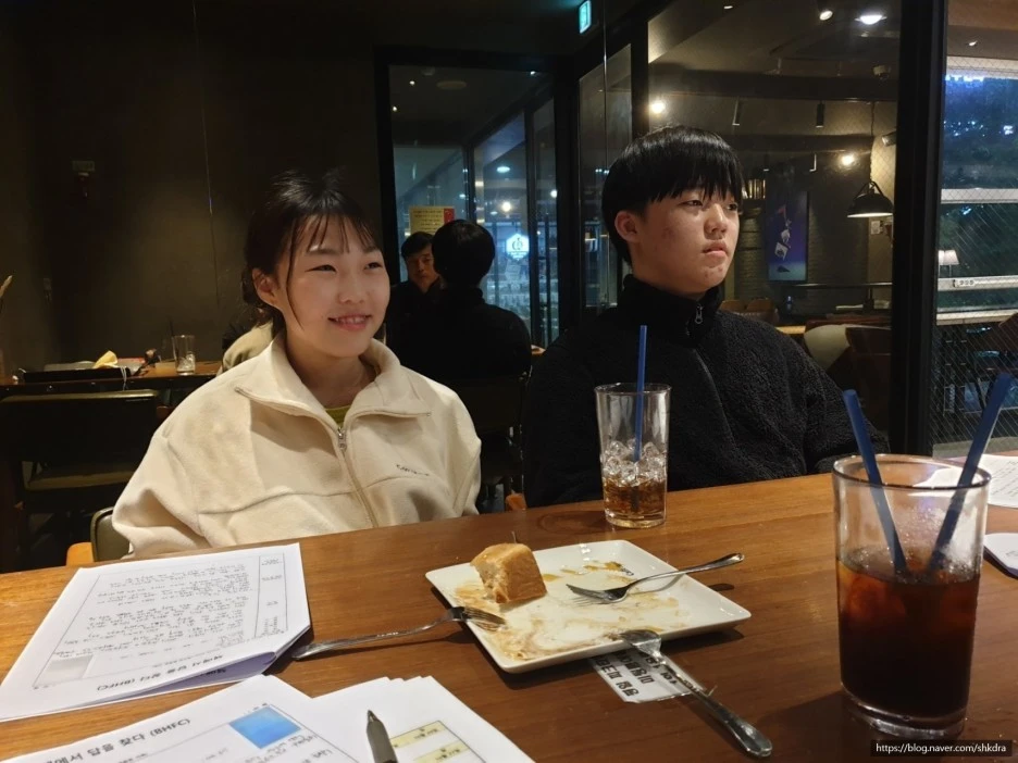 우리 동네 카페, 2층 스터디룸이 비었는지 확인하고 음료를 시키고 기다리는 동안 인증샷을 담는다. 그리고 딸아이가 선정했으니 딸아이가 진행한다. 쑥스럽고 어색함에 말은 짧지만 씩씩하게 잘하고 있다. 경청이 함께다