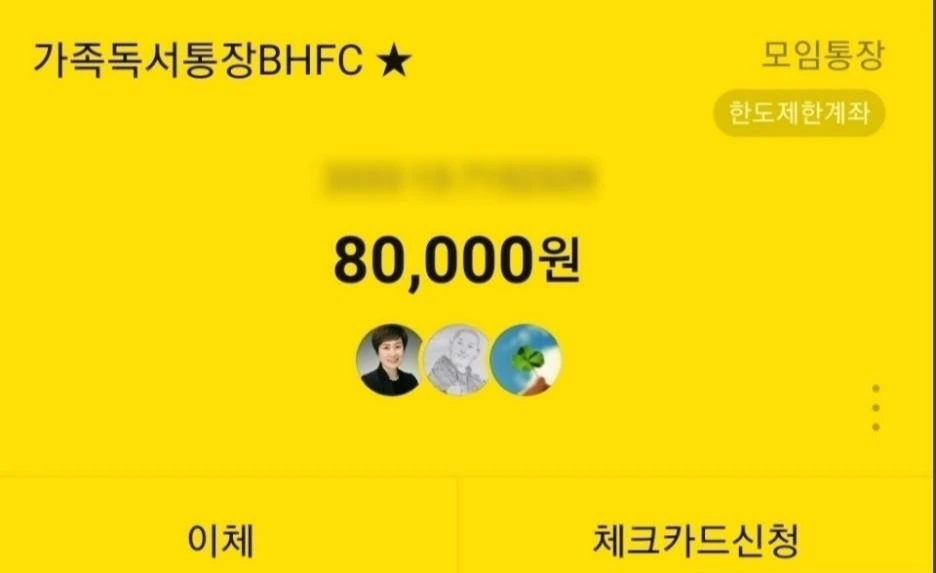 가족 독서통장 (BHFC)가족 독서모임을 할 때마다 1인당 만 원씩 기부해 독서통장을 만들기로 했고, 2번의 진행으로 8만 원이 모였다. 통장 개설은 간편함에 있어 독보적이라고 열이면 열 모두가 극찬하는 카카오 뱅크, 회비를 모을 수 있는 계모임 통장이란 게 있어 뚝딱, 쉽게 만들었다. 이름하여 가족 독서통장(BHFC)이다.