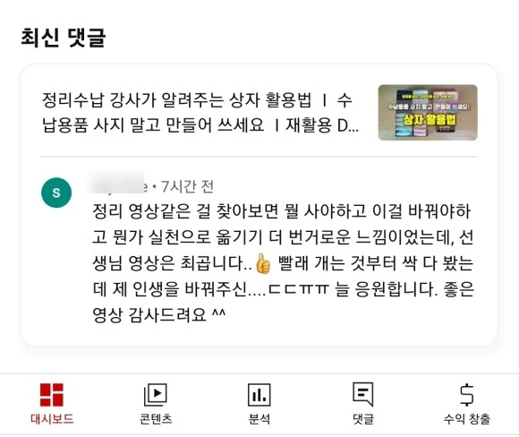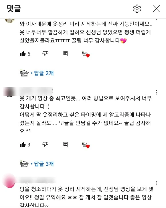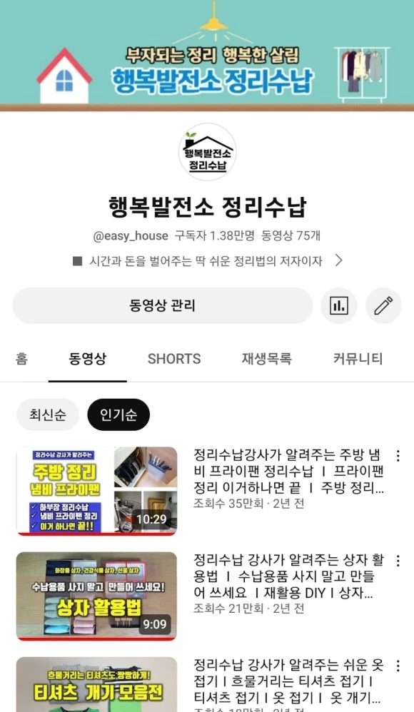2020년 5월 1일 주변의 권유로 무작정 시작한 유튜브, 올해로 꼬박 3년이 되었다. 살림하고 강의하는 틈틈이 만드는 콘텐츠라 자주 올리지는 못하지만 정리 초보라면 어떤 게 궁금할까 어떤 게 어려울까를 생각하고 왕초보의 기준에 맞춰 만들고 있다. 모든 사람을 만족시킬 수는 없다. 그럼에도 불구하고 초심을 잃지 않고 더디지만 조금씩 나아가고 있다.