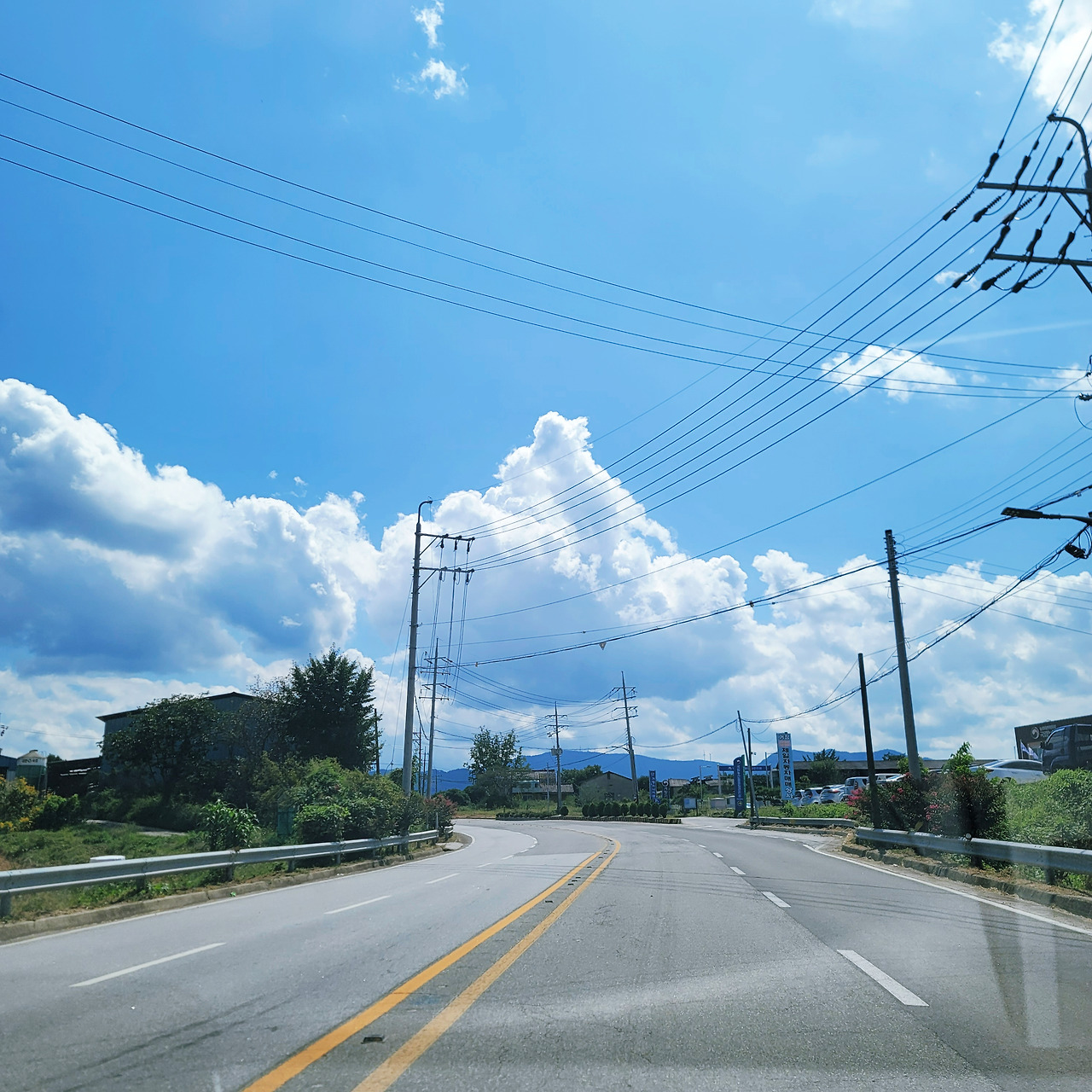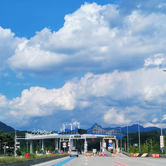 뭉게구름과 한적한 도로에 소풍 가듯 한 시간 남짓만에 도착한 거창, 톨게이트 지붕의 저 모형은 거창한 산 모양일까? 궁금해진다.