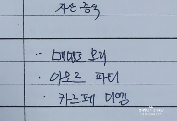 비우기 부분에서는 시간 낭비, 돈 낭비, 귀차니즘, 부정적인 생각 등 여러 의견이 있었다. 나의 비우기는 늦게 자는 습관이다. 오늘 자고 내일 일어나는 게 여전한 나의 목표다.