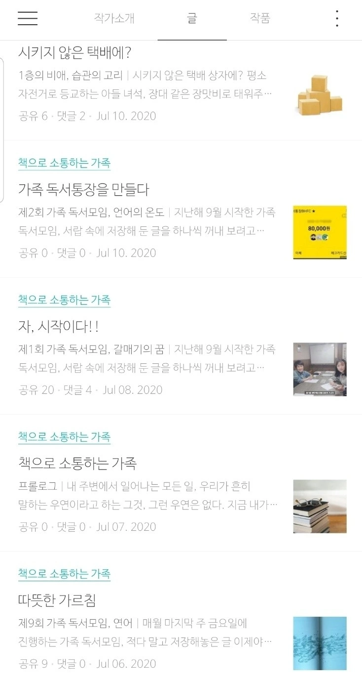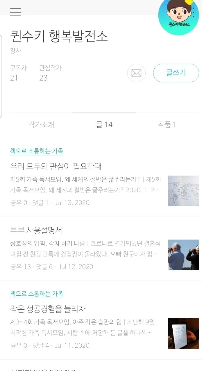 브런치 작가가 된 지 20일째 오늘 기준, 내 소중한 구독자는 21명이며 14개의 글을 발행했다. 발행한 글의 많은 부분이 적게는 6번부터 많게는 20번까지 공유가 되었다. 뿌듯함에 자기 효능감이 쑥쑥 올라간다.'책으로 소통하는 가족'이라는 매거진을 만들어 가족 독서모임의 소중한 추억을 담아내고 있다. 언젠가 책으로 엮어낼 꿈이자 가족 모두의 소중한 유산이 되리라 믿는다.