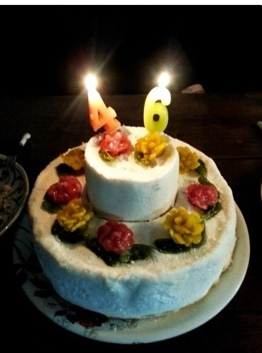아주버님 46번째 생일날 , 어머니표 케이크건강한 먹거리를 고집하며 두부도 직접 만들어주시고, 주스도, 도넛도, 칼국수에 찹쌀가루 묻혀 튀긴 치킨에 케이크까지 전부 만들어 주신다. 아들 내외 손주 생일까지 생일 때면 백설기로 2단 케이크를 만들고 치자, 시금치, 비트 등 천연색소로 곱고 정성스레 만드신 꽃을 올린 당신만의 케이크와 잡채에 갈비찜 등 각종 잔치음식을 만들어 집까지 배달해주셨다. 못 가는 날이면 손수 만든 셋 집의 음식을 끄는 캐리어에 넣고 과일까지 무겁게 챙겨 버스와 지하철로 다녀가신다.