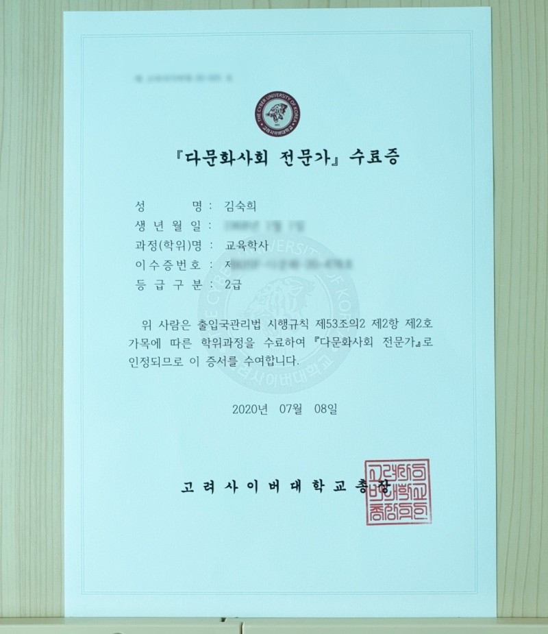그리고 엊그제 등기가 도착했다. 대학에서 이루어진만큼 대학교 총장명의의 수료증과 법무부 장관이 정하는 교육 15시간을 이수함으로써 한국 이민 재단 이사장 명의의 이수증이 함께 도착했다. 다문화사회 전문가 2급 자격 취득을 통해 사회통합 프로그램 중 '한국사회의 이해' 강사로 활동할 수 있는 자격이 주어졌다. 물론 강의를 위해서는 더 많은 공부가 필요하다. 9과목 이수로 투자한 시간만큼이나 이 땅에 온 다문화가족이 잘 적응하여 소기의 목적을 달성함으로써 윈윈 할 수 있도록 따뜻한 가족의 시선으로 함께하고 싶다. 좋은 이미지를 심어주고 싶다.