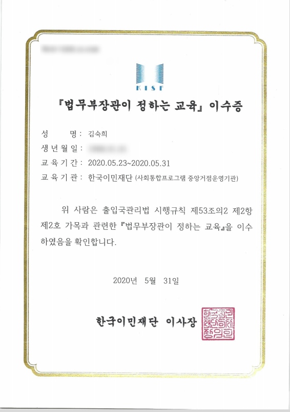 '법무부 오프라인 교육 15시간 이수'