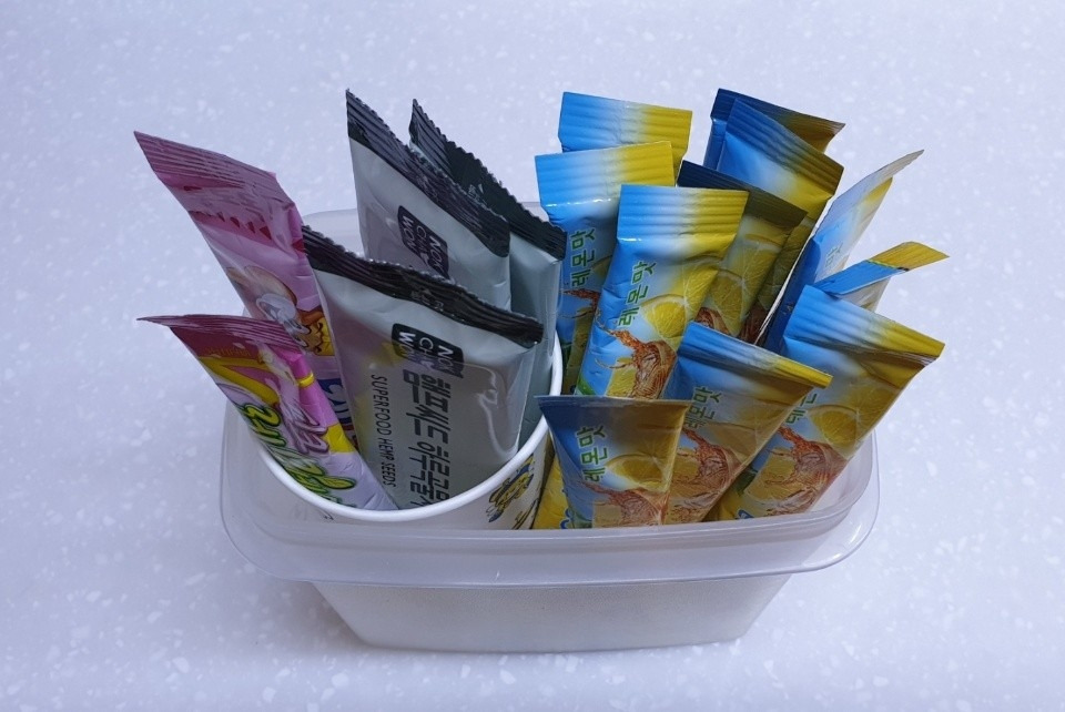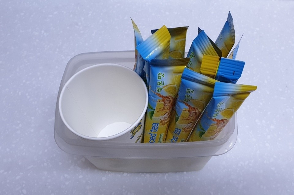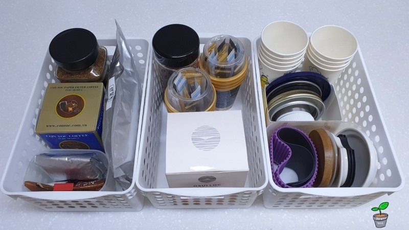 양은 많지 않고 여러 종류가 한 공간에 있을 경우 그냥 둬도 되지만 집에 있는 작은 밀폐용기나 상자로 칸을 나눠주면 좋다. 사진에는 있는 종이컵을 활용했지만 둥근모양보다 사각형이 공간 효율에 좋다.