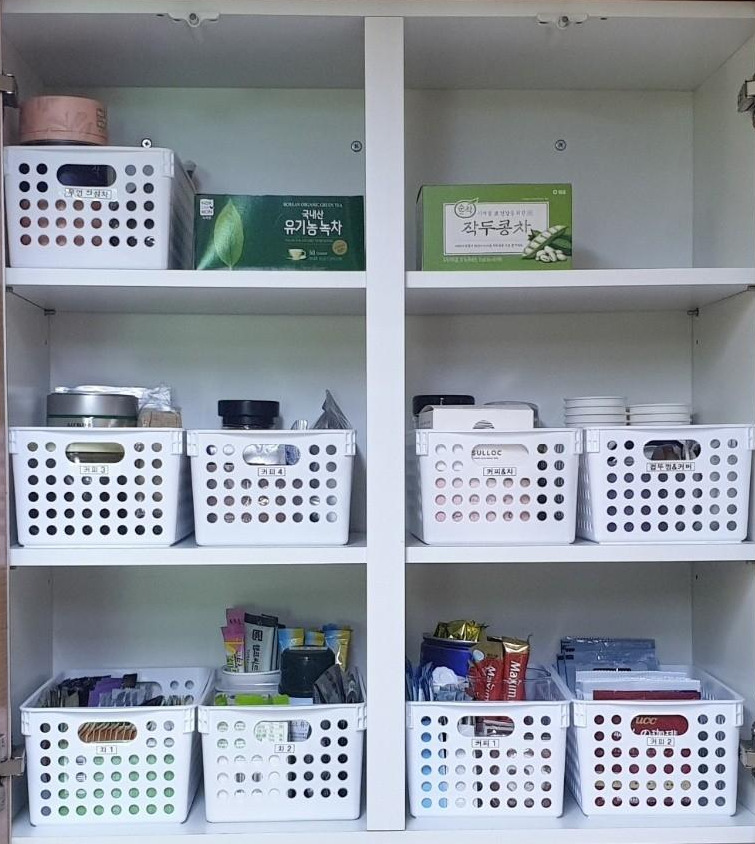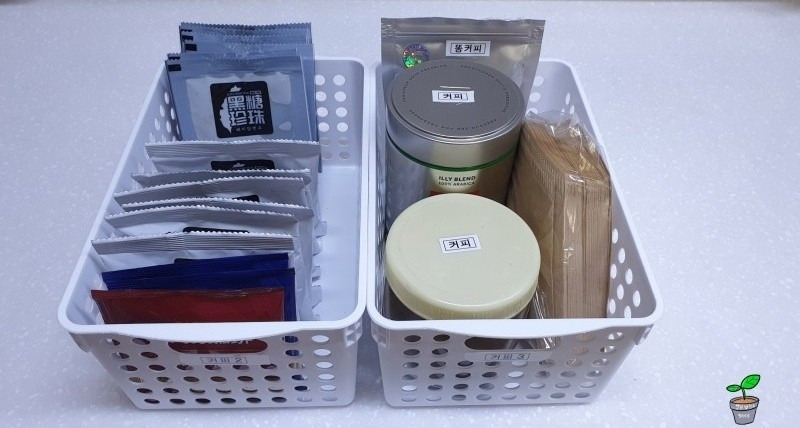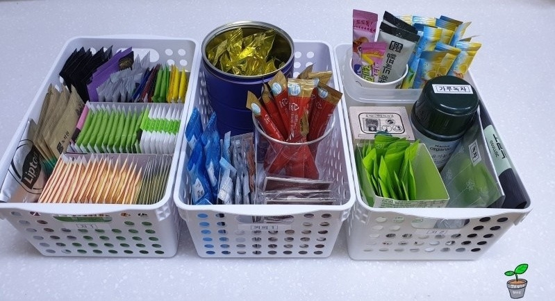 바구니나 상자로 집을 만들어주면 좋은 이유는 총량을 규제할 수 있다는 거다. 예를 들면 커피나 녹차는 해당 바구니에 들어갈 만큼만 구입하는 거다. 싸다고 사고 공짜라고 받아오는 게 아니라 언제나 각각의 집에 들어갈 만큼만 구입하다 보면 소비습관을 바꾸는데도 좋다. 왜냐하면 정리된 공간은 힐링을 부르며 보는 순간 유지하고 싶은 욕망도 함께 따라오기 때문이다.