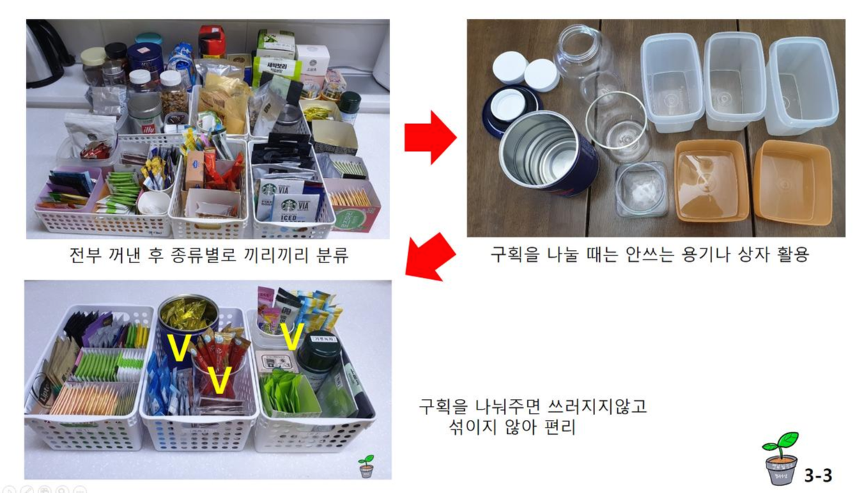 - 구획 나누기는 바구니, 상자, 밀폐용기 활용