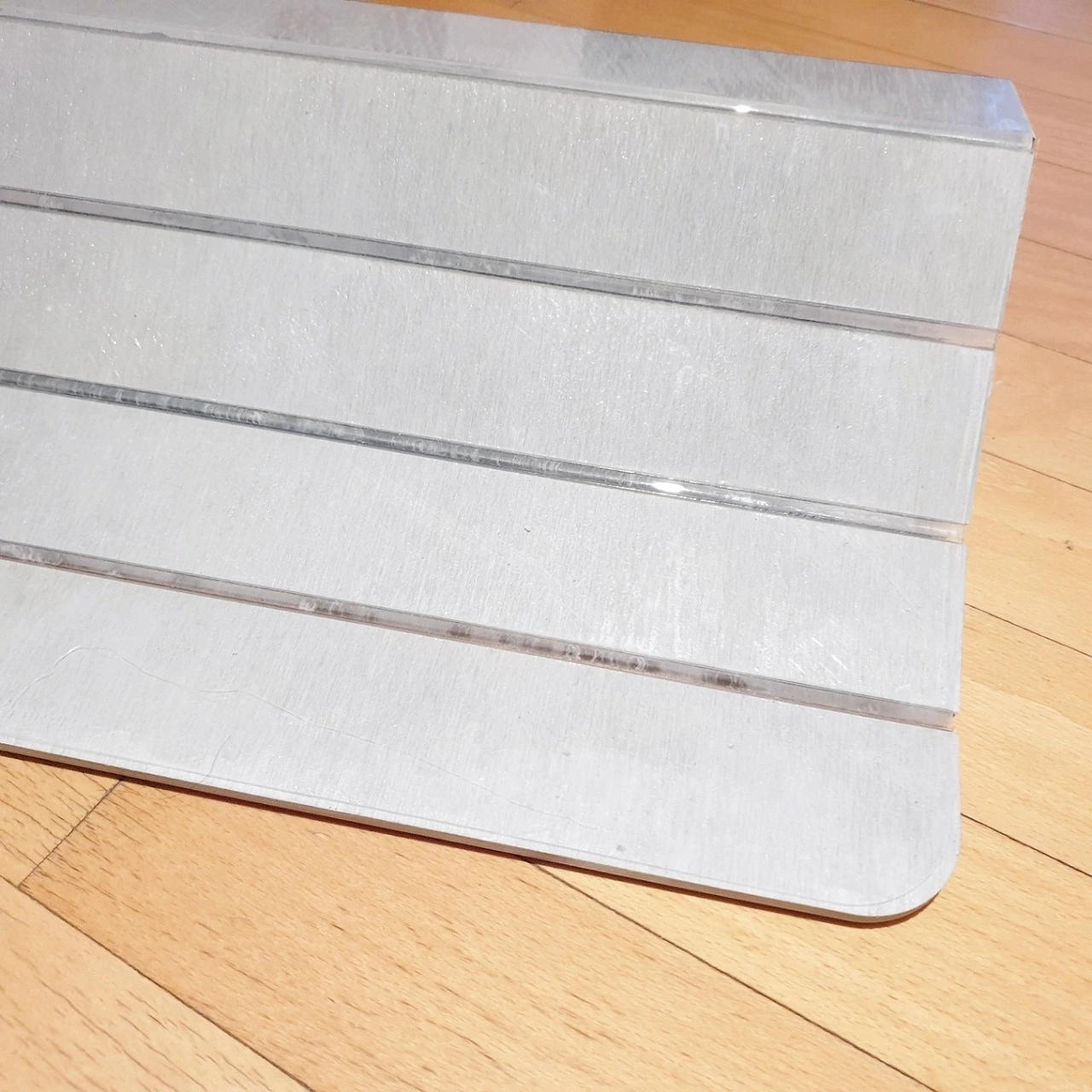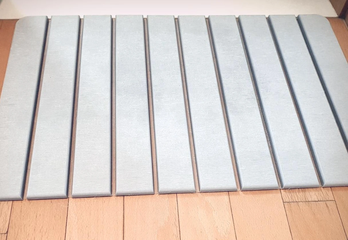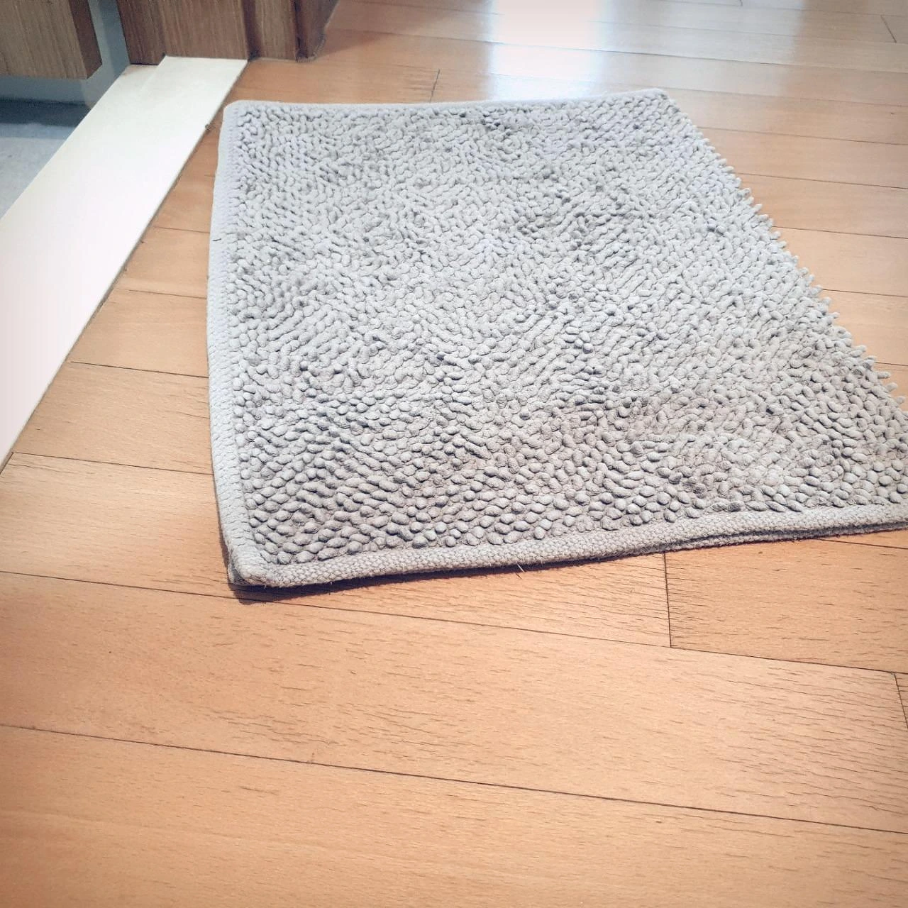 급하게 나오거나 할 때면 어김없이 이렇게 제자리를 벗어난다. 바닥에 미끄럼 방지 처리도 안 되어 있는 데다 적당한 사이즈가 없어 큰 걸 구입했고 거실 욕실 앞에는 반을 접어 사용 중이다. 그러다 보니 자리 이탈이 더 심하다. 더군다나 균형 잡기가 힘든 어르신들은 자칫 잘못하면 넘어져 다칠 수도 있는 상황이다.