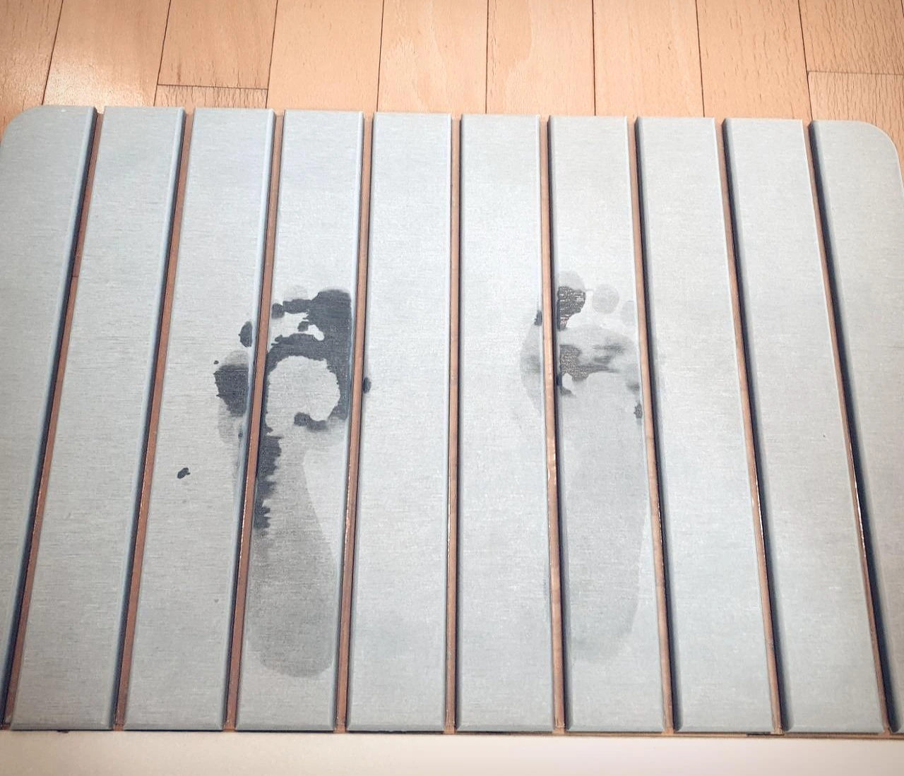 크기나 미끄럼 방지보다 더 좋은 규조토 매트의 진가는 바로 이거다. 물기 있는 발을 떼자마자 흡수되기 시작한다. 규조토, 말 그대로 흙으로 만든 매트다.