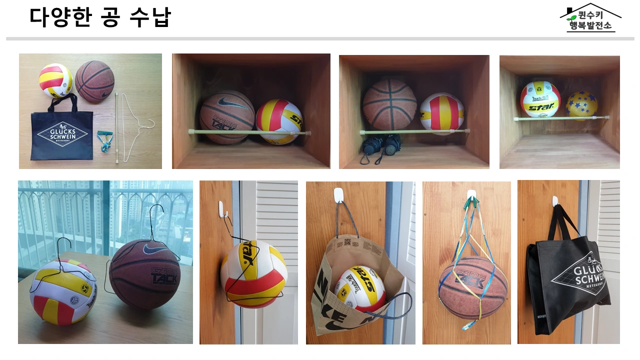 아이들을 키우다 보면 축구공 농구공 등 공 1~2개쯤은 가지고 있을 거다. 밖에서 가지고 노는 공은 대부분 현관 바닥에 두거나 신발장 안에 보관하는 경우가 많은데 굴러다니는 공의 특성상 현관 바닥에 두면 좁아서 불편하기도 하지만 잘못 밟았을 경우 다칠 우려가 있다. 그래서 오늘은 공을 보다 쉽고 안전하게, 효율적으로 보관하는 방법에 대해 알아보도록 하자.