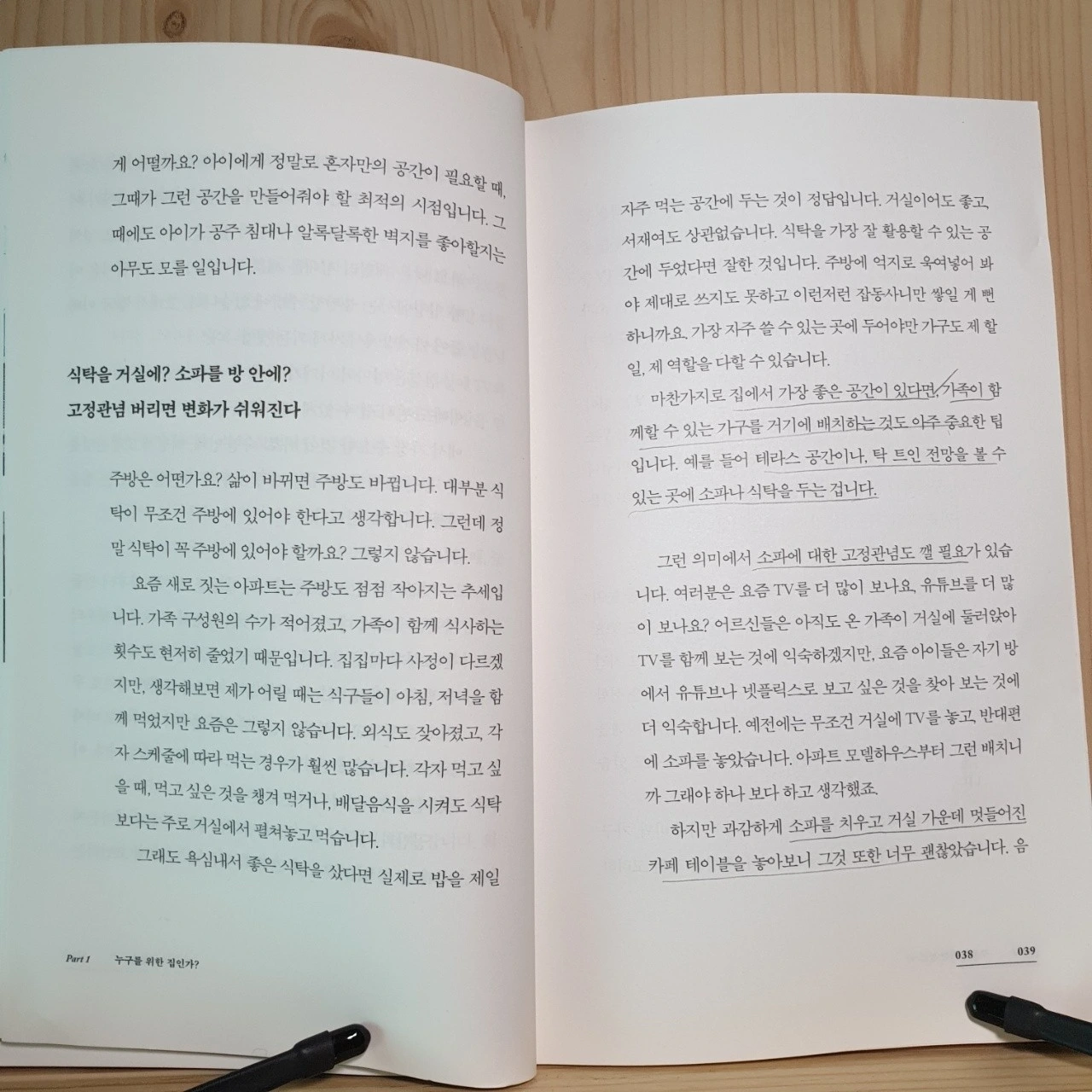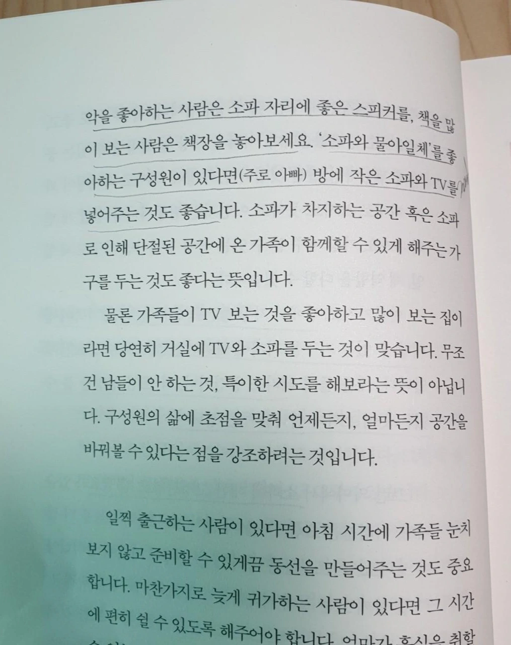 음악을 좋아하는 사람은 소파 자리에 좋은 스피커를, 책을 좋아하는 사람은 책장을 놓아 보세요. 소파와 물아일체를 좋아하는 구성원이 있다면 방에 작은 소파와 TV를 넣어주는 것도 좋습니다.