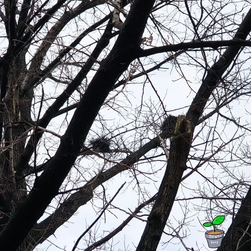 수상데크가 아니라 오늘은 옆길로 샌다. 텃밭이 보인다. 여기저기 가을걷이 흔적이다. 버려진 배춧잎에 사뿐히 내려앉은 서리가 정겹다. 폭신폭신 흙 밟는 느낌이 참 좋다. 바람 소리가 요란하다. 목이 떨어져라 올려다본 나무, 난간에 이웃해 있는 까치집 2개다. 신기했다. 비바람에도 무너지지 않는 집이라니... 까치집을 보며 단단함에 대해 생각했다.