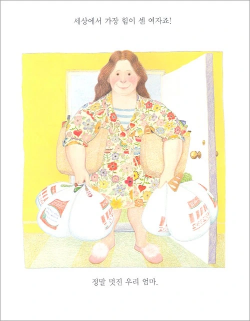 16kg가 넘는 둘째 아이는 아직도 아침에 일어나면 엄마에게 안겨 침대 밑으로 내려와 화장실까지 가야 한다. 찾아보니 요즘 많이 볼 수 있는 어린이 킥 보드의 무게는 대략 10kg이란다. 아이가 둘인 나는 도합 20kg 무게의 킥보드 두 개를 손가락 마디 사이에 겨우 걸고, 다른 한 손엔 가방과 아이 손을 잡고 걸었던 경험도 다반사다. 아이들을 키우는 엄마는 매일매일 아이든, 짐이든 무언가 무거운 것들을 번쩍번쩍 들어내야 한다. 그래서 유명한 동화작가 '앤서니 브라운'의 '우리 엄마'라는 동화책에서 양 손 가득 무거운 짐을 들고 서 있는 엄마의 그림과 함께 "세상에서 가장 힘센 여자죠! 정말 멋진 우리 엄마"라는 문구를 발견했을 땐 경악했다. 분명 과장해서 그린 그림인데 너무나 사실적이어서...그리고 또 한 편으로는 어이가 없었다. 이렇게 힘이 세지 못한 엄마는 멋지지 않은 건가?