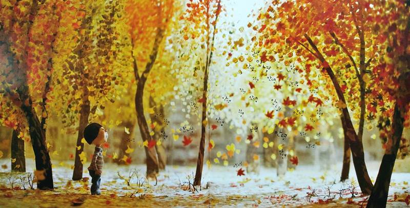 이른 아침, 아이의 등원 길. 나무는 저마다 노란빛 붉은빛을 내고 있고, 색 바랜 낙엽들이 공원 가득 떨어져 있다.